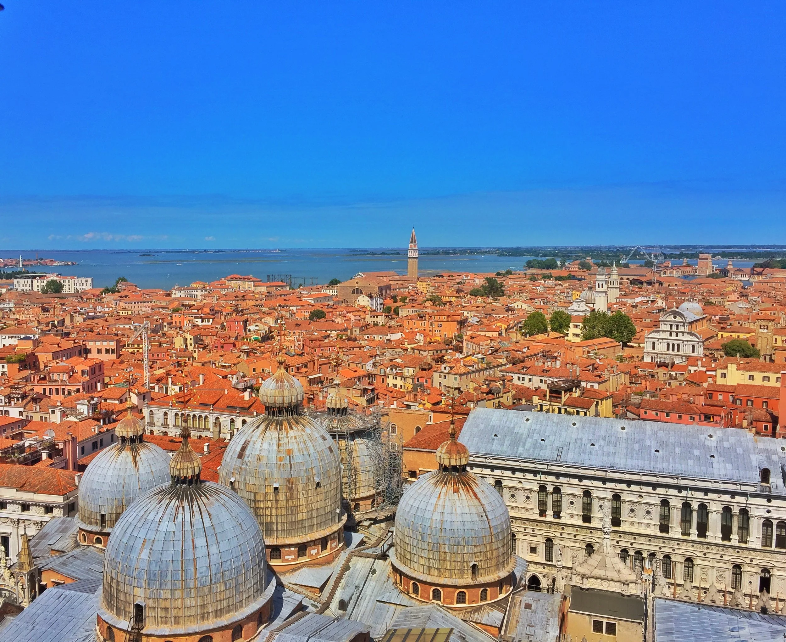 After exploring Venice for a few hours by foot, we opted to explore Venice from a Bird’s eye view. We joined the queue of people waiting to climb the Campanile, the bell tower which dominates the skyline of Venice. It was originally built in the 9th century but has been reconstructed several times, with only one of the original 5 bells remaining today. It was such a beautiful, sunny day and we were rewarded with stunning views of Venice and the surrounding islands. It was definitely worth the 8 Euro Elevator ride.